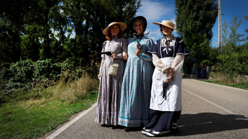 Women dressed in period costmes carry pistols during the reenactment of scenes from Western The Good, The Bad And The Ugly, in Carazo, Burgos province, Spain, September 8, 2024. The Sad Hill Association, a group of locals and film buffs, have attracted thousands of fans to the area after renovating original sets used in Italian director Sergio Leone’s The Good, The Bad and The Ugly, including Betterville Prison and Sad Hill graveyard, scene of the iconic shootout between protagonists Clint Eastwood, Lee Van Cleef and Eli Wallach. REUTERS/Vincent West