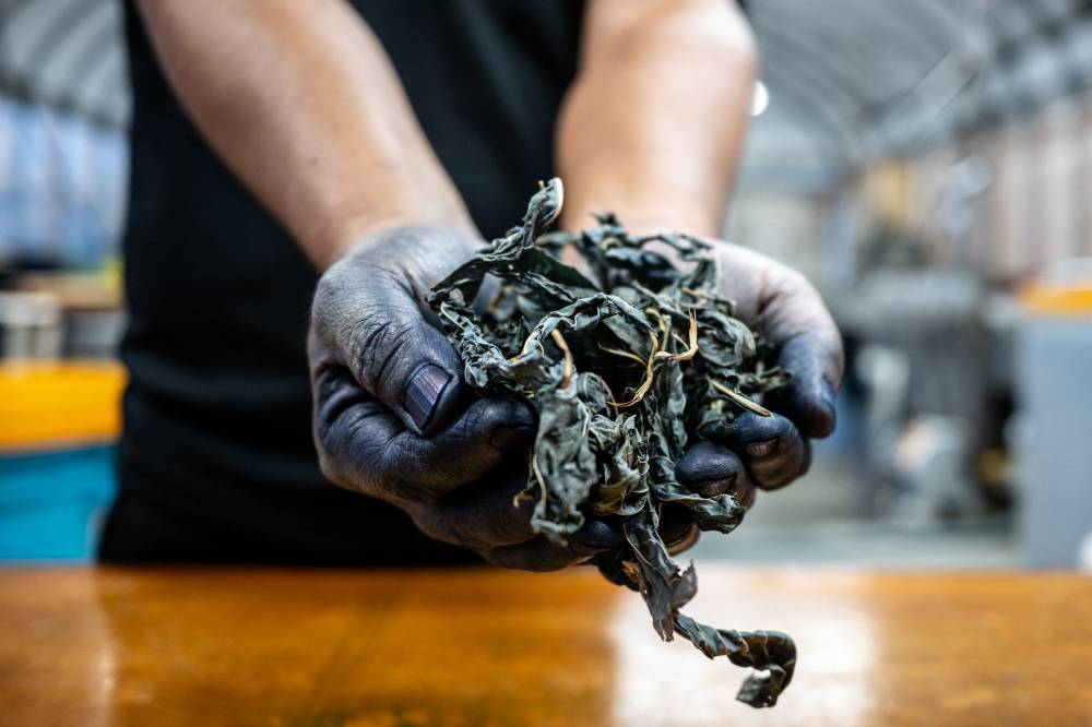 The cotton is imported from Zimbabwe, but the natural indigo they use is harvested in Japan — its colour far richer than synthetic imitations, according to Okamoto.