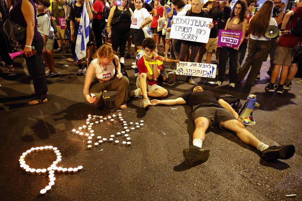 Demonstrators light candles as man during an anti-government protest calling for action to secure the release of Israeli hostages held captive since the October 7 attacks by Palestinian militants in the Gaza Strip, in front of the Israeli Defence Ministry in the coastal city of Tel Aviv on September 3, 2024, amid the ongoing war between Israel and the militant Hamas group. (Photo by Jack GUEZ / AFP).