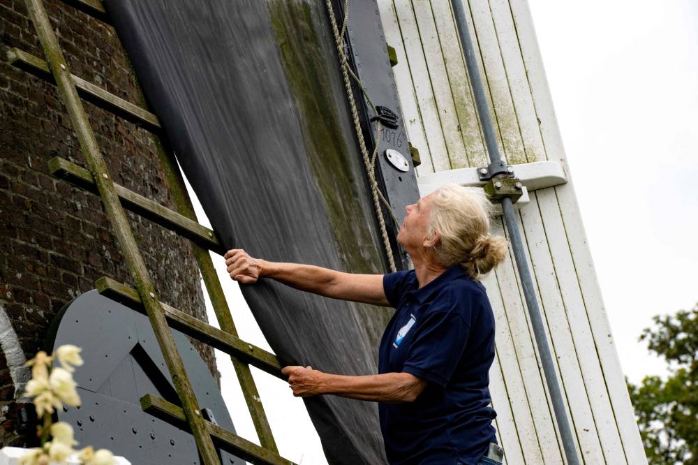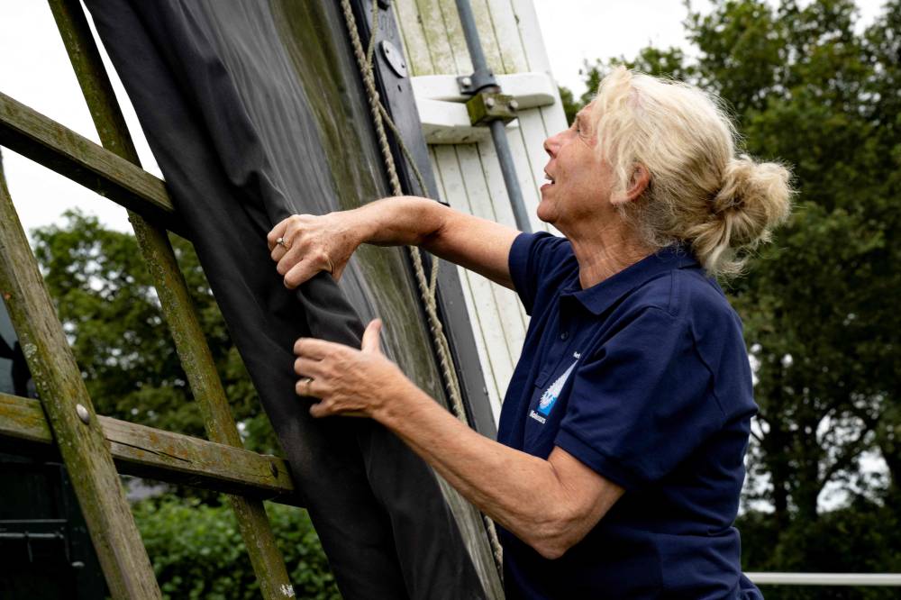 Dutch artist Peet Wessels, who is famous for painting windmills on the mill's used canvas sails, adjusts the sails of De Heimolen, an ancient wheat mill in Rucphen-Bosschenhoofd, near the southern Dutch city of Breda, on July 25, 2024. Dutch artist Peet Wessels might not call it an obsession, but with over 100 images of windmills in her home, it's clear she's a big fan -- her walls practically whirl with admiration. She is training to become a real-life miller -- someone who operates and maintains a windmill -- joining a growing number of women in what was once seen as a man's world. (Photo by Nick Gammon / AFP)