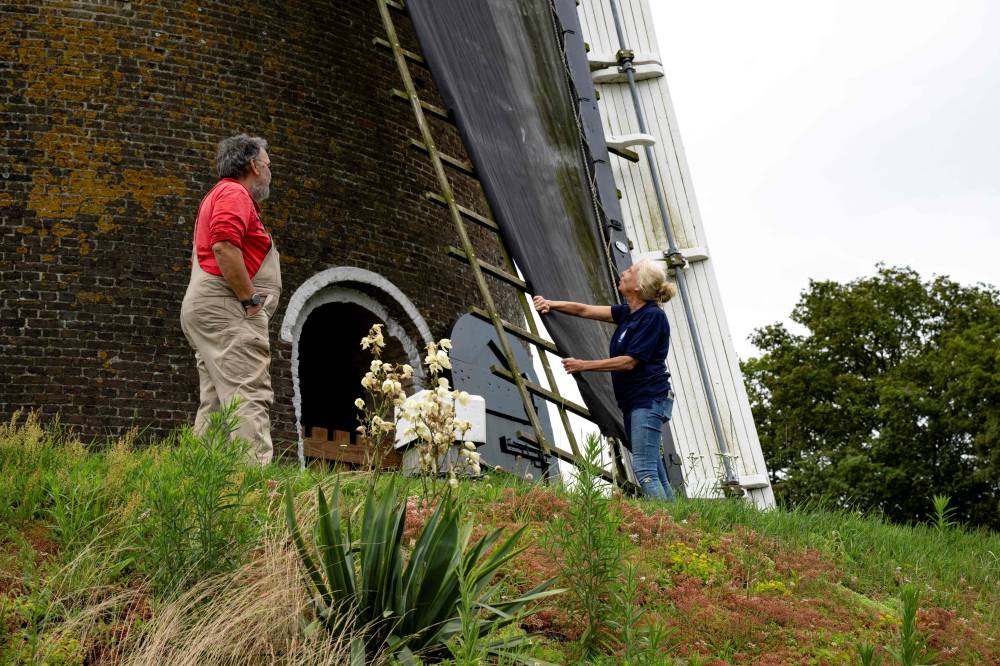 Dutch artist Peet Wessels (R), who is famous for painting windmills on the mill's used canvas sails, adjusts the sails of De Heimolen, an ancient wheat mill in Rucphen-Bosschenhoofd, near the southern Dutch city of Breda, on July 25, 2024. Dutch artist Peet Wessels might not call it an obsession, but with over 100 images of windmills in her home, it's clear she's a big fan -- her walls practically whirl with admiration. She is training to become a real-life miller -- someone who operates and maintains a windmill -- joining a growing number of women in what was once seen as a man's world. (Photo by Nick Gammon / AFP)