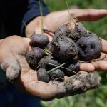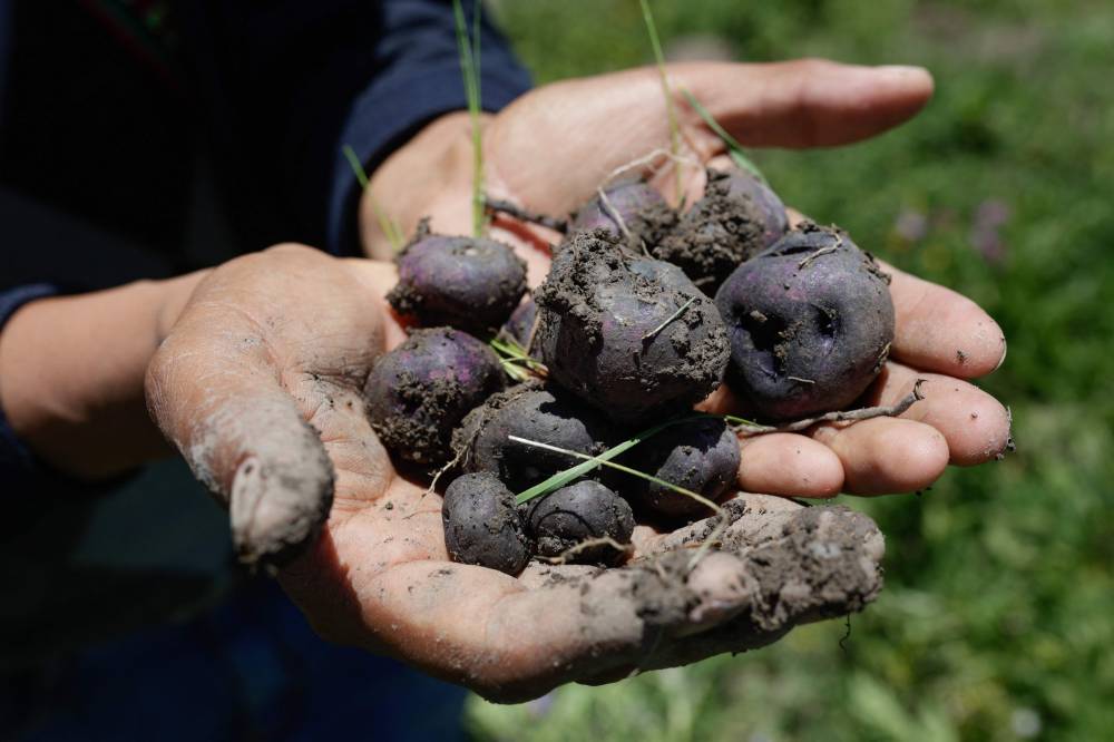 A peasant holds a handful of native potatoes grown using the ancient agricultural technique called Waru Waru, an ancient agricultural technique, at a field in the Acora district in Puno, Peru, on February 1, 2024. It was believed the ancient agricultural system of geometric forms found 45 minutes away from the city of Puno at 3,832 m.a.s.l. above sea level could be the work of extraterrestrials, whoever scientists have sustained the Waru Waru is an ancient Andean technology characterized by water and soil management, seed selection, crop rotation and microclimate, as explained by agricultural engineer Gaston Quispe explains that the community decided ta few decades ago to build these ancestral Andean technology of groves and channels that fulfill the functions of water collection, sub-irrigation and drainage. (Photo by Juan Carlos CISNEROS / AFP)