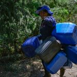 A woman carries gallons of water to help to put out the forest fire in Nemocon, Colombia on January 26, 2024. Yesterday Colombia asked the member countries of the United Nations for help to extinguish around thirty forest fires that are ravaging several regions and drowning the capital, Bogota, in smoke. (Photo by Roberto Cisneros / AFP)