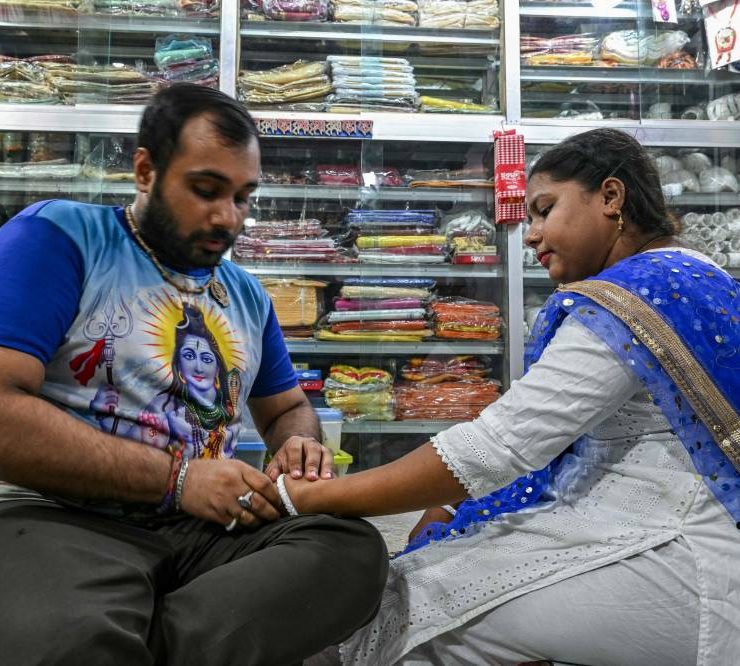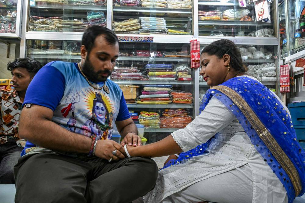 A Hindu shopkeeper (L) wearing a t-shirt with a portrait of Lord Shiva helps a woman put on a traditional conch shell bangle at a shop selling traditional prayer items in Shakhari Bazar, a Hindu majority area, in Dhaka on August 9, 2024, days after a student-led uprising that ended the rule of ousted premier Sheikh Hasina. After Hasina's abrupt resignation and flight abroad on August 5 brought an end to her 15 years of autocratic rule, numerous Hindu families came into the crosshairs of their neighbours. (Photo by Indranil MUKHERJEE / AFP)