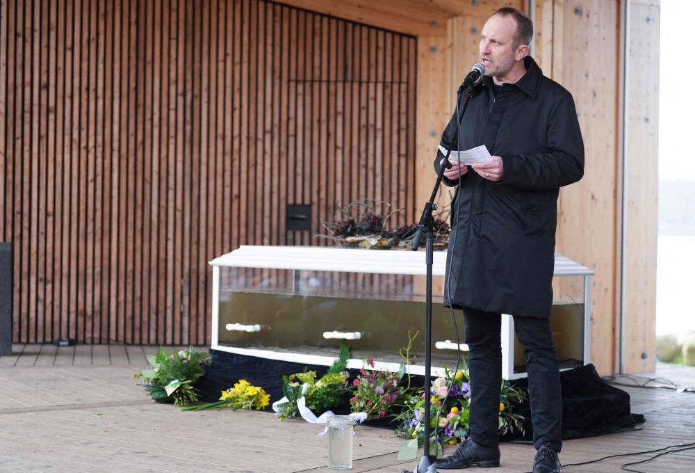 Martin Lidegaard of The Social Liberal Party speaks during the happening ‘Funeral for Vejle Fjord’ in Vejle, Denmark, on April 6, 2024. (Photo by Claus Fisker / Ritzau Scanpix / AFP)