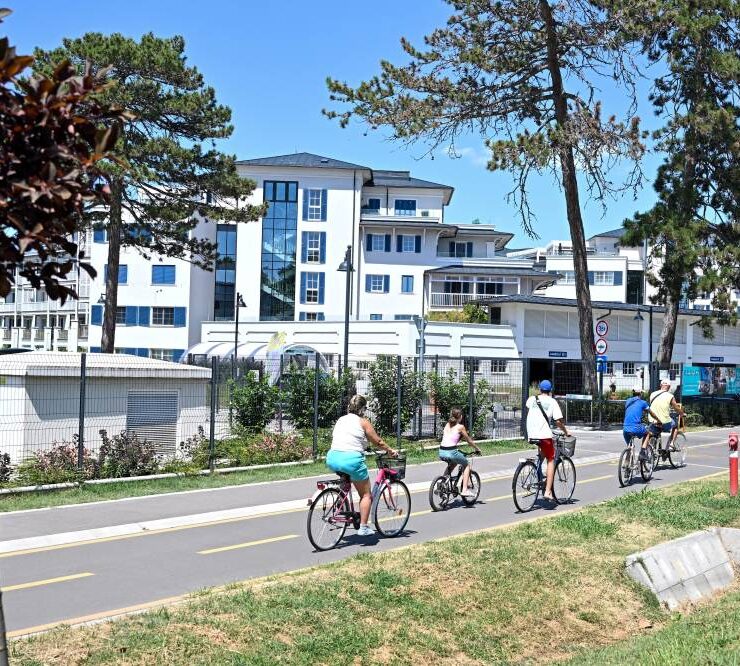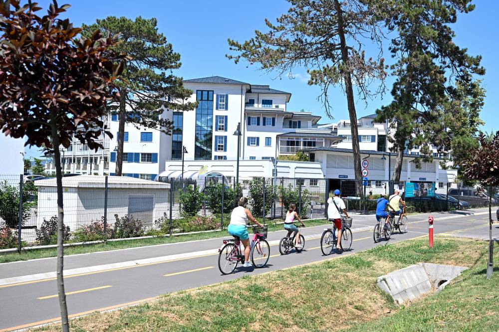 A picture taken on July 29, 2024 shows people riding bikes in front of buildings of a new construction, the 'Balaland' on the bank of the Balaton lake in the town of Szantod, Hungary. It's the "Hungarian Sea": the turquoise Lake Balaton, the largest in Central Europe, attracts families every summer. But the open-air beaches and campsites are gradually being replaced by luxury hotels and private areas. (Photo by ATTILA KISBENEDEK / AFP)