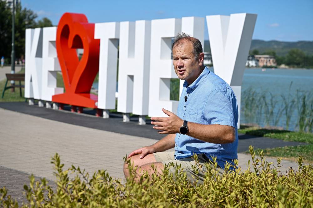 A picture taken on July 29, 2024 shows Gergely Toth, alternative economist and mayor-elect of Keszthely by the bank of the Balaton lake in the town of Keszthely, Hungary. It's the "Hungarian Sea": the turquoise Lake Balaton, the largest in Central Europe, attracts families every summer. But the open-air beaches and campsites are gradually being replaced by luxury hotels and private areas. (Photo by ATTILA KISBENEDEK / AFP)
