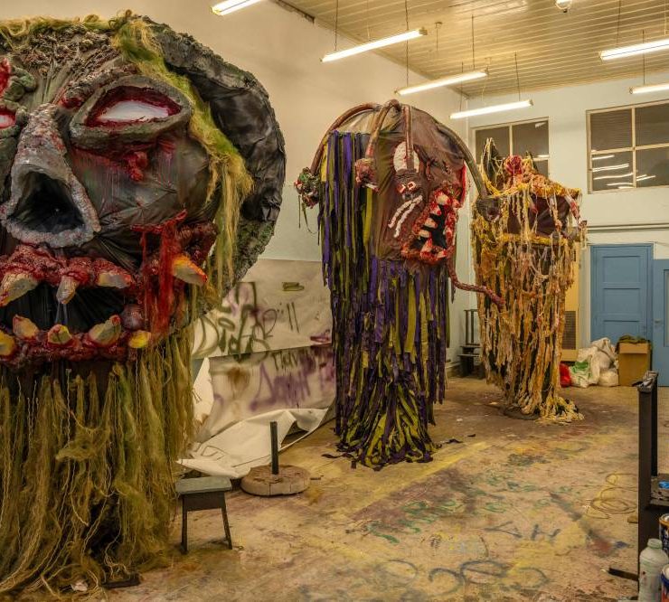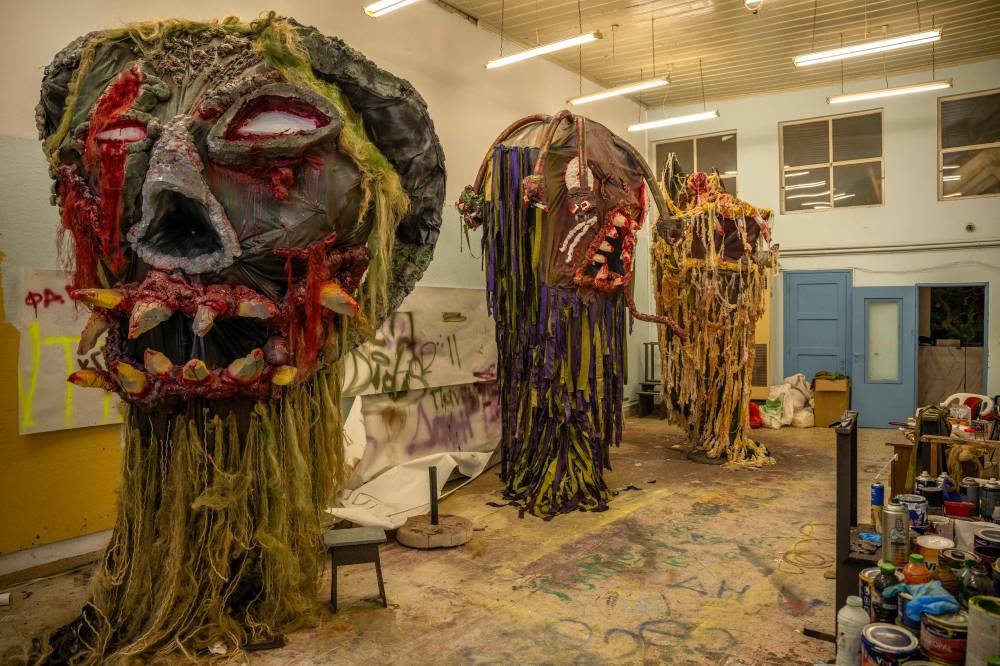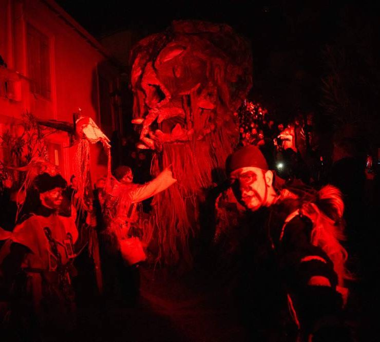 Amfissa’s ghost is a giant monster made of cardboard, rope and fabric, parading through the night. The head is misshapen, teeth long and eyes bulging.