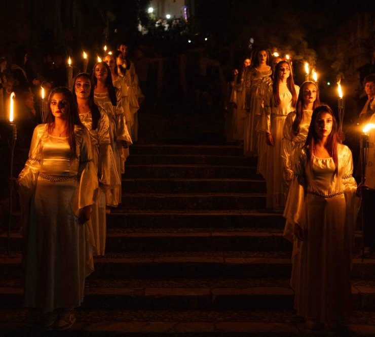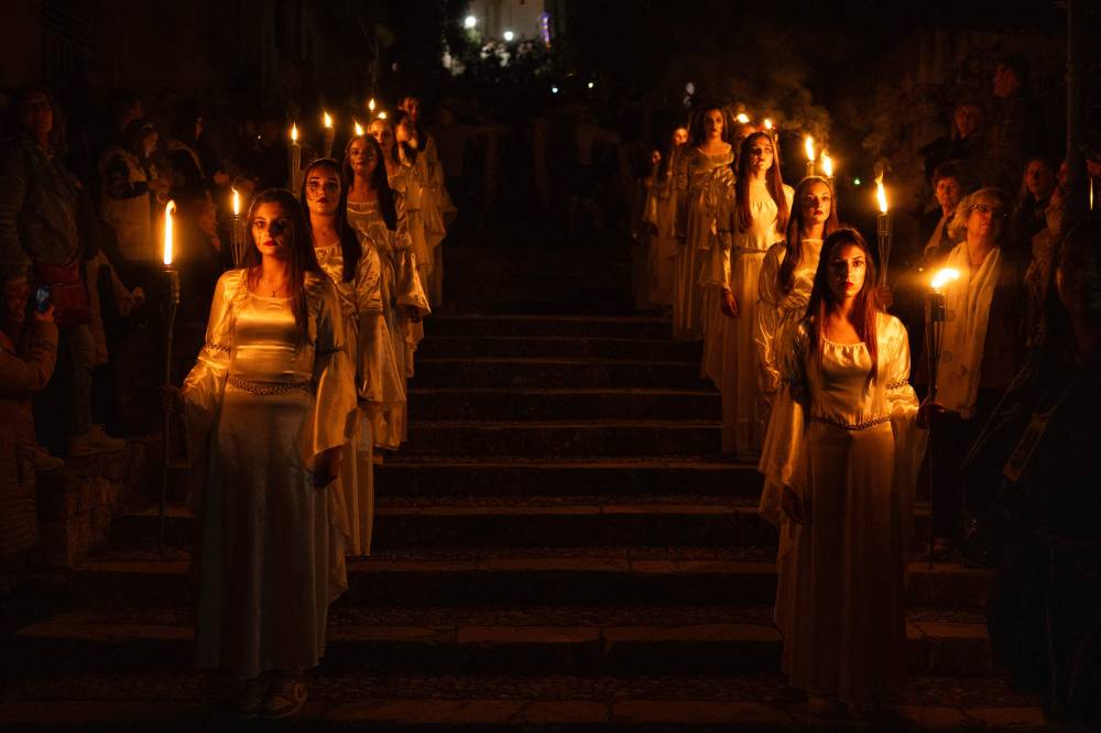 On the Saturday evening, the “Ghost of Charmaina” ponderously descends the 120 stone steps from the church to the main square, flanked by orange groves and cafes with wooden doors and shutters.