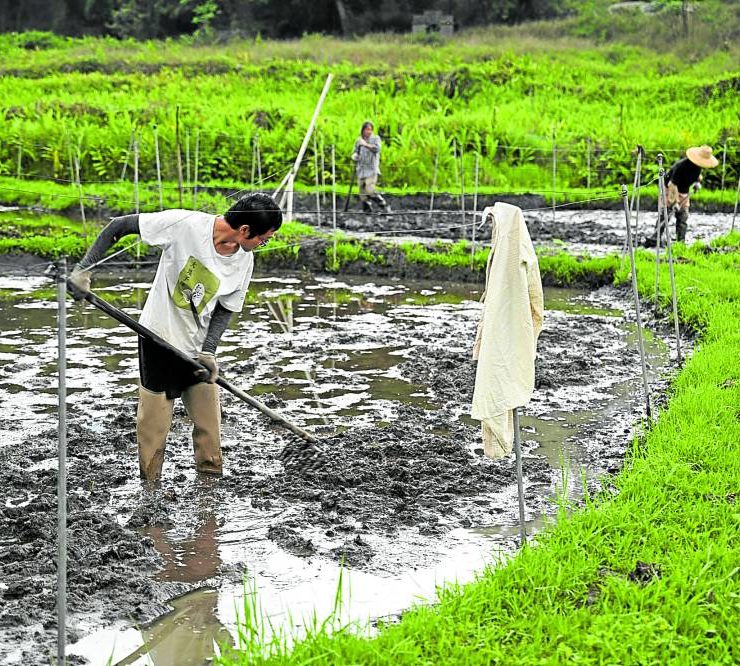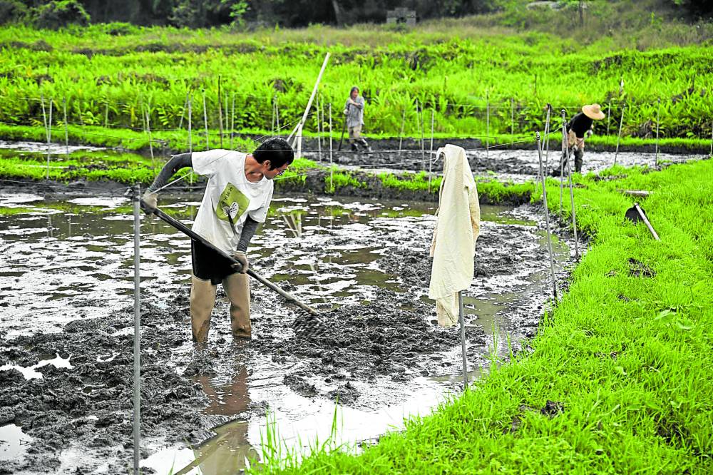 This photo taken on April 1, 2024 shows members of Gift From Land, a small group dedicated to revitalising dormant rice varieties that used to be grown in the Chinese territory, preparing a rice paddy for planting in the Tai Po district of Hong Kong. Far from the soaring skyscrapers synonymous with Hong Kong, scientists and farmers labour in a paddy field on the city's outskirts to revive dormant rice varieties that once sprung from local soil. While agriculture accounts for less than 0.1 percent of the finance hub's GDP, researchers say homegrown grains could one day be an important food security insurance policy in the face of climate change -- while also feeding hometown pride in history, culture and identity. (Photo by Peter PARKS / AFP) / To go with AFP story Hong Kong-China-agriculture-history-rice, FEATURE by Xinqi SU