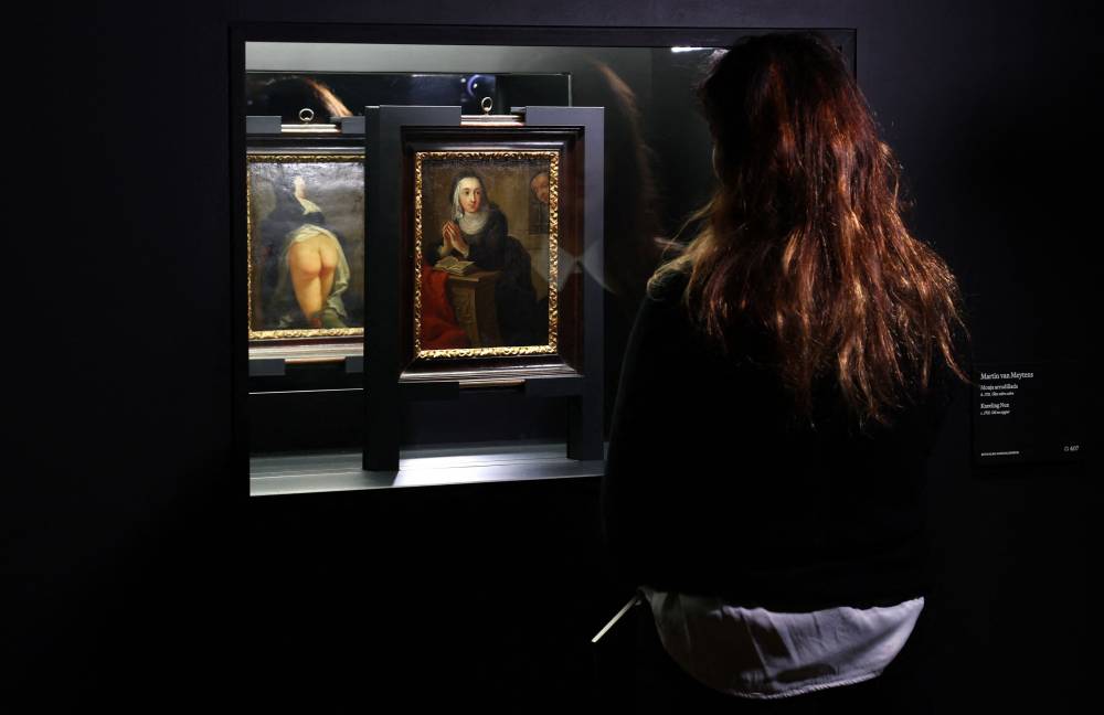 A visitor looks at a painting called “Kneeling Nun” by Swedish painter Martin Van Meytens, with its front side on the right and the back side seen in a mirror, as part of the Reversos exhibition, which presents the hidden back sides of renowned paintings, at the Prado Museum in Madrid on December 5, 2023. A new exhibition at Madrid’s Prado museum is throwing a spotlight on the reverse side of paintings, letting visitors see labels, seals and sketches that are usually hidden from view. The goal of the show, called Reversos (On the Reverse), is to change the viewer’s point of view and take them behind the scenes to open a “door to the secrets of art,” said the exhibition’s curator, Miguel Angel Blanco. (Photo by Thomas COEX / AFP) / RESTRICTED TO EDITORIAL USE – MANDATORY MENTION OF THE ARTIST UPON PUBLICATION – TO ILLUSTRATE THE EVENT AS SPECIFIED IN THE CAPTION