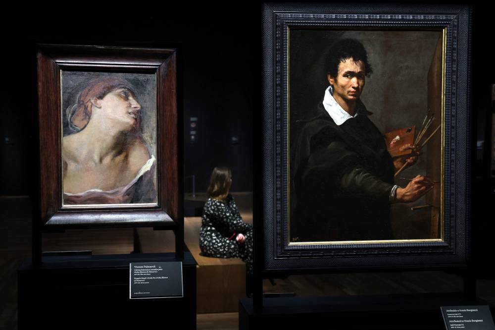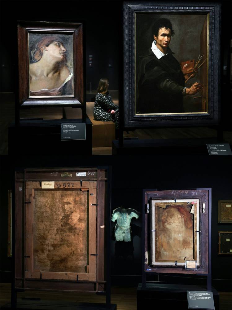 This photograph shows two paintings called “Female head” (L) attributed to Spanish painter Vicente Palmaroli and “Self portrait” (R) by Italian painter Orazio Borgianni, as part of the Reversos exhibition, which presents the hidden back sides of renowned paintings, at the Prado Museum in Madrid on December 5, 2023. A new exhibition at Madrid’s Prado museum is throwing a spotlight on the reverse side of paintings, letting visitors see labels, seals and sketches that are usually hidden from view. The goal of the show, called Reversos (On the Reverse), is to change the viewer’s point of view and take them behind the scenes to open a “door to the secrets of art,” said the exhibition’s curator, Miguel Angel Blanco. (Photo by Thomas COEX / AFP) / RESTRICTED TO EDITORIAL USE – MANDATORY MENTION OF THE ARTIST UPON PUBLICATION – TO ILLUSTRATE THE EVENT AS SPECIFIED IN THE CAPTION