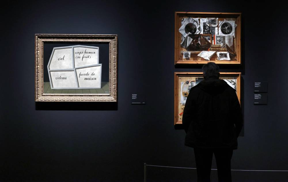 A visitor looks at a painting called “The empty mask” (L) by Belgian artist Rene Magritte, as part of the Reversos exhibition, which presents the hidden back sides of renowned paintings, at the Prado Museum in Madrid on December 5, 2023. A new exhibition at Madrid’s Prado museum is throwing a spotlight on the reverse side of paintings, letting visitors see labels, seals and sketches that are usually hidden from view. The goal of the show, called Reversos (On the Reverse), is to change the viewer’s point of view and take them behind the scenes to open a “door to the secrets of art,” said the exhibition’s curator, Miguel Angel Blanco. (Photo by Thomas COEX / AFP) / RESTRICTED TO EDITORIAL USE – MANDATORY MENTION OF THE ARTIST UPON PUBLICATION – TO ILLUSTRATE THE EVENT AS SPECIFIED IN THE CAPTION