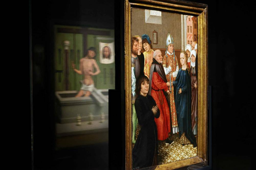 This photograph shows a painting called “The marriage of the Virgin” by a master of the legend of Saint Catherine, with its front side on the right and the back side seen in a mirror, as part of the Reversos exhibition, which presents the hidden back sides of renowned paintings, at the Prado Museum in Madrid on December 5, 2023. A new exhibition at Madrid’s Prado museum is throwing a spotlight on the reverse side of paintings, letting visitors see labels, seals and sketches that are usually hidden from view. The goal of the show, called Reversos (On the Reverse), is to change the viewer’s point of view and take them behind the scenes to open a “door to the secrets of art,” said the exhibition’s curator, Miguel Angel Blanco. (Photo by Thomas COEX / AFP) / RESTRICTED TO EDITORIAL USE – MANDATORY MENTION OF THE ARTIST UPON PUBLICATION – TO ILLUSTRATE THE EVENT AS SPECIFIED IN THE CAPTION
