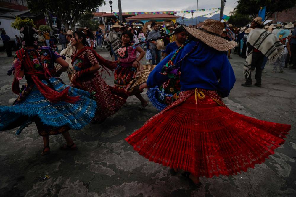 Purepecha痴 Indigenous women dance during a 3-day ceremonial procession from Cocucho to Ocumicho indigenous villages in Michoacan State, Mexico, on January 31, 2024. Every year, Purepecha痴 Indigenous people from different regions of Michoacan State celebrate the Fuego Nuevo Purepecha (Purepecha痴 New Fire), a fire lighting ceremony to mark the start of the new year. (Photo by RODRIGO OROPEZA / AFP)