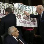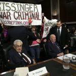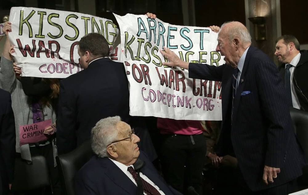 (FILES) Protesters shout “Arrest Henry Kissinger for war crimes” as (L-R) Former U.S. Secretary of State Henry Kissinger; former U.S. Secretary of State George Shultz and and former U.S. Secretary of State Madeleine Albright wait to testify before the Senate Armed Services Committee January 29, 2015 in Washington, DC. Former US secretary of state Henry Kissinger, a key figure of American diplomacy in the post-World War II era, died November 29, 2023 at the age of 100, his association said. (Photo by WIN MCNAMEE / GETTY IMAGES NORTH AMERICA / AFP)
