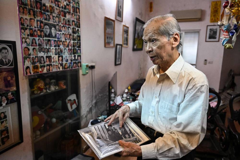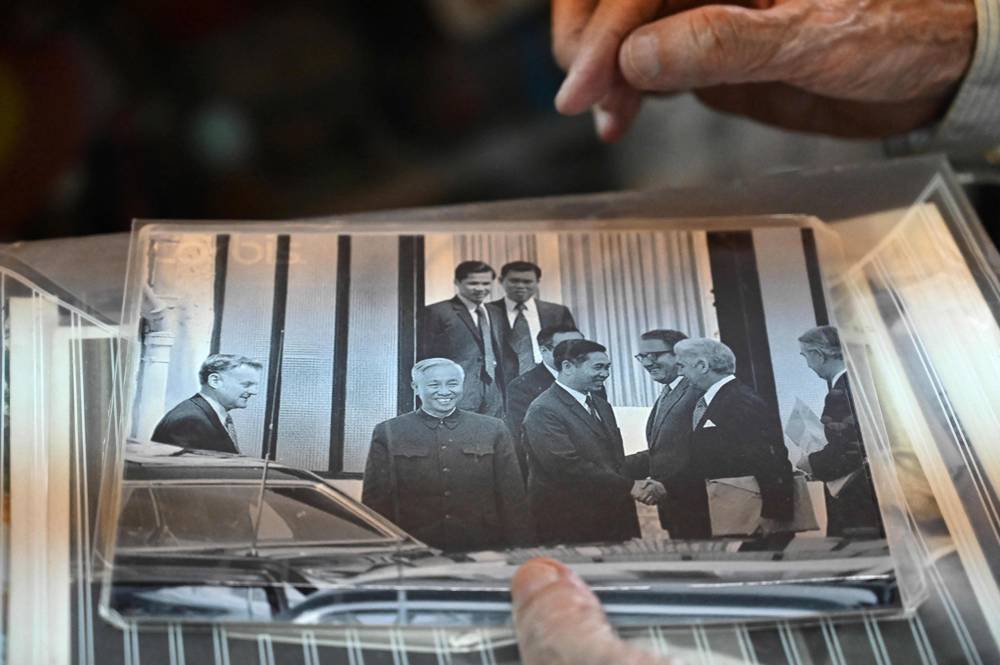 This photo taken on December 1, 2023 shows Pham Ngac, a former Vietnamese diplomat and interpreter for North Vietnam’s delegation during the Paris Peace Accord negotiation, showing an old photo, featuring himself and the-then US secretary of state Henry Kissinger, at his home in Hanoi. Pham Ngac said Kissinger was “outstanding” in the negotiations. “He was the most… persuasive diplomat, to the benefit of the US,” the 88-year-old told AFP. (Photo by Nhac NGUYEN / AFP)