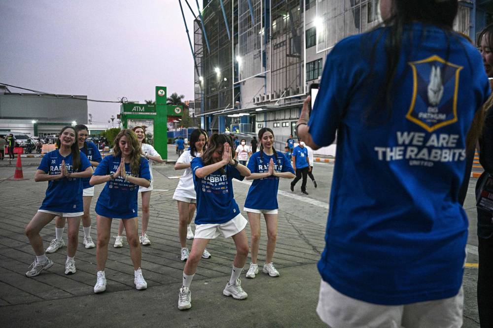 This photo taken on March 9, 2024 shows Rabbit Girls skipping towards the stands to begin cheerleading duties during BG Pathum United FC’s Thai League 1 football match against Sukhothai at BG Stadium in Pathum Thani. In a rowdy Bangkok stadium, BG Pathum United’s “Rabbit Girls” dance to a drumbeat and cheer their team on — the Thai football league’s last band of women promoters. (Photo by Lillian SUWANRUMPHA / AFP)