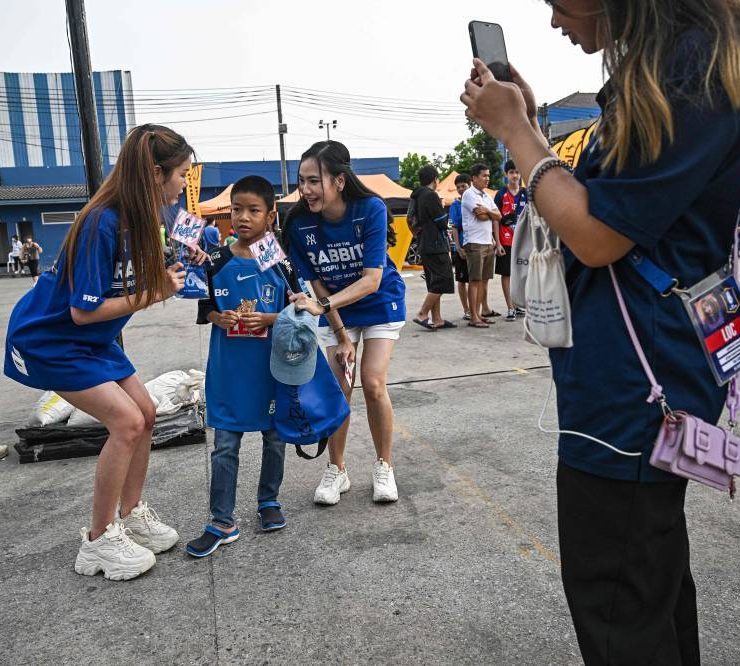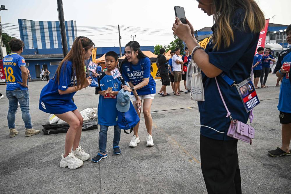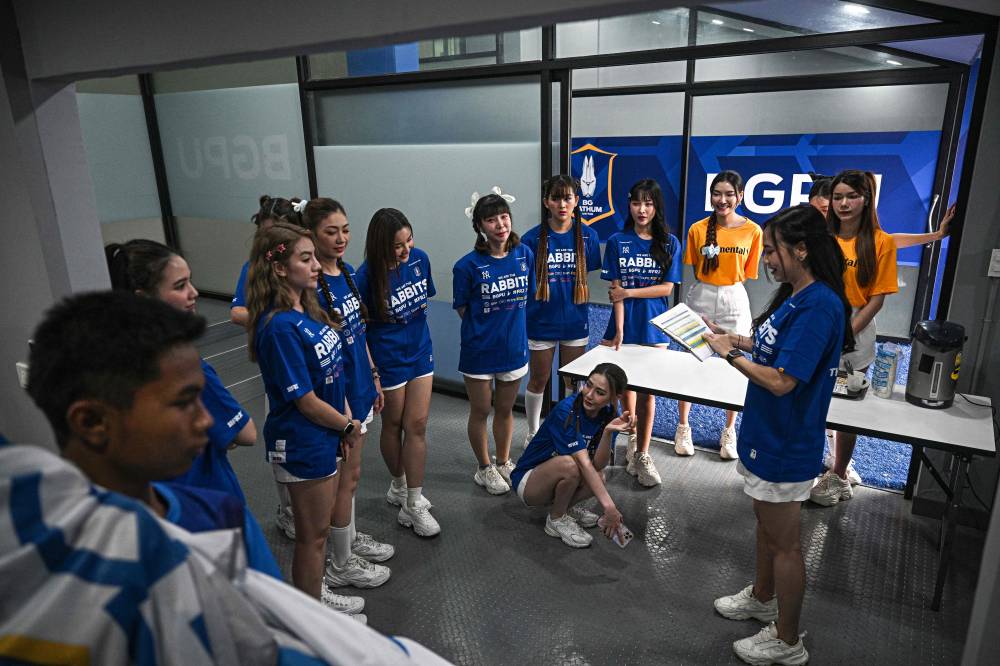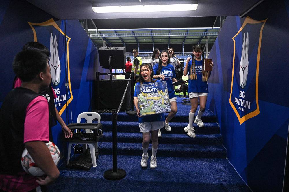 This photo taken on March 9, 2024 shows Rabbit Girls emceeing for social media before BG Pathum United FC’s Thai League 1 football match against Sukhothai at BG Stadium in Pathum Thani. In a rowdy Bangkok stadium, BG Pathum United’s “Rabbit Girls” dance to a drumbeat and cheer their team on — the Thai football league’s last band of women promoters. (Photo by Lillian SUWANRUMPHA / AFP)
