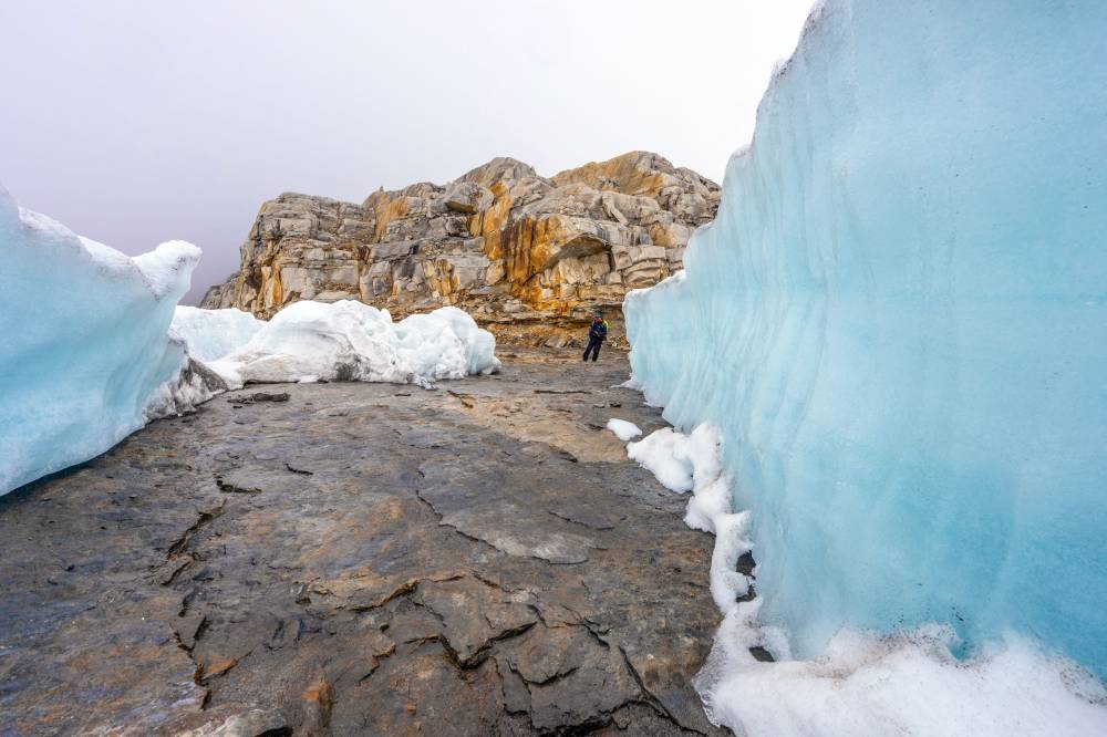 TOPSHOT - A tourist explores the Ritacuba Blanco glacier at El Cocuy National Natural park in Boyaca province, Colombia on April 19, 2024. The Ritacuba Blanco glacier, one of Colombia's highest snow-capped peaks, should be covered by a blanket of homogeneous snow. But a brutal El Niٌo phenomenon melted it and exposed gigantic crevasses, a sign of its agony. (Photo by Luis ACOSTA / AFP) / TO GO WIHT AFP STORY BY DAVID SALAZAR