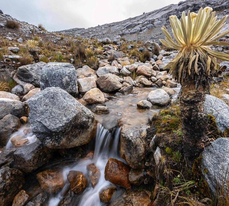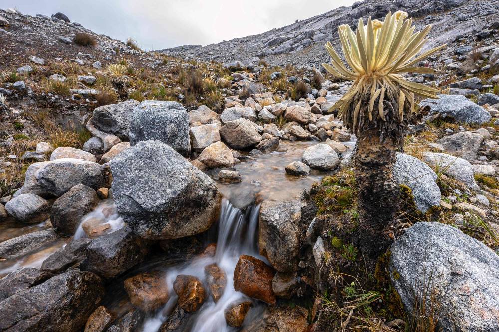 A frailejon (Espeletia pycnophylla) is seen at the Ritacuba's trail at El Cocuy National Natural park in Boyaca province, Colombia on April 19, 2024. The Ritacuba Blanco glacier, one of Colombia's highest snow-capped peaks, should be covered by a blanket of homogeneous snow. But a brutal El Niٌo phenomenon melted it and exposed gigantic crevasses, a sign of its agony. (Photo by Luis ACOSTA / AFP) / TO GO WIHT AFP STORY BY DAVID SALAZAR