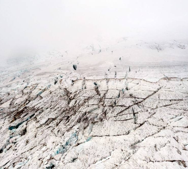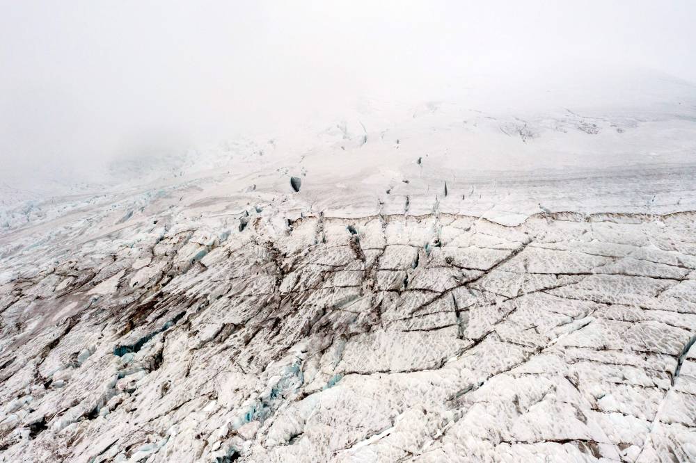 Aerial view of the Ritacuba Blanco glacier at El Cocuy National Natural park in Boyaca province, Colombia on April 19, 2024. The Ritacuba Blanco glacier, one of Colombia’s highest snow-capped peaks, should be covered by a blanket of homogeneous snow. But a brutal El Niٌo phenomenon melted it and exposed gigantic crevasses, a sign of its agony. (Photo by Luis ACOSTA / AFP) / TO GO WIHT AFP STORY BY DAVID SALAZAR.