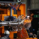 The experiment saw the engine blast out a blue-and-orange flame 10-15 meters horizontally out of an open hangar door for around 10 seconds in the rural northern town of Taiki.