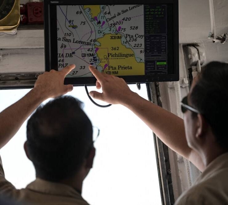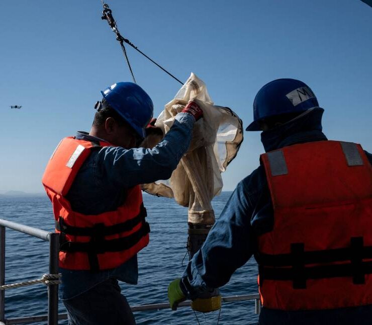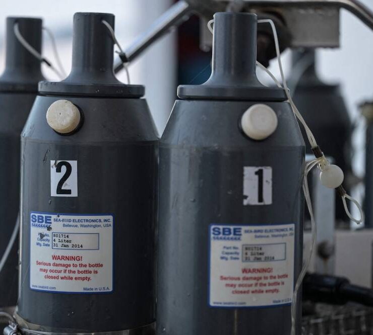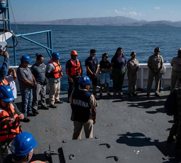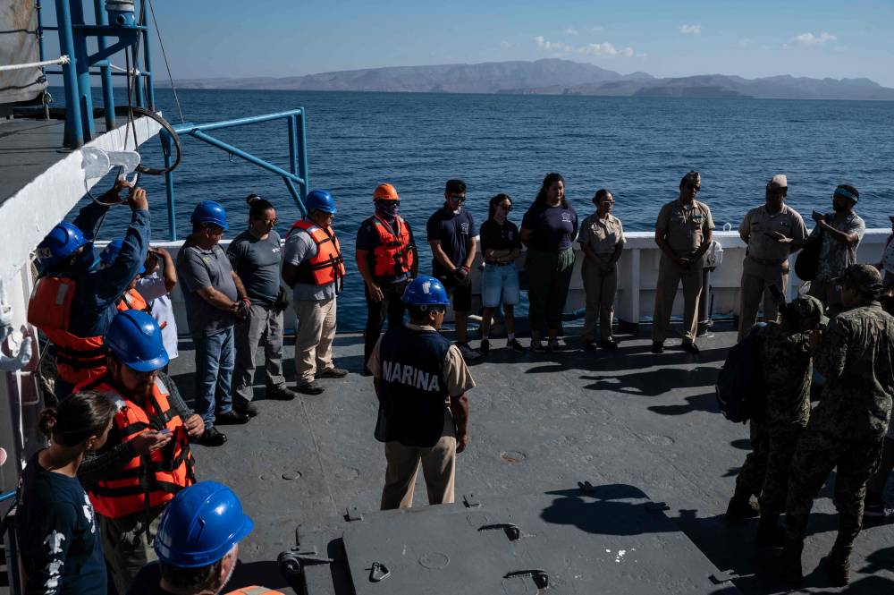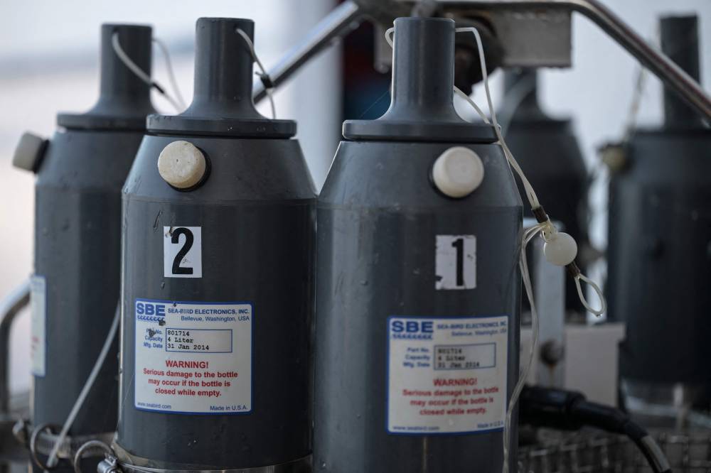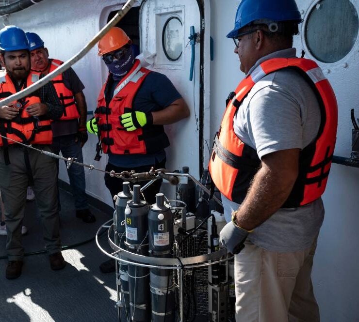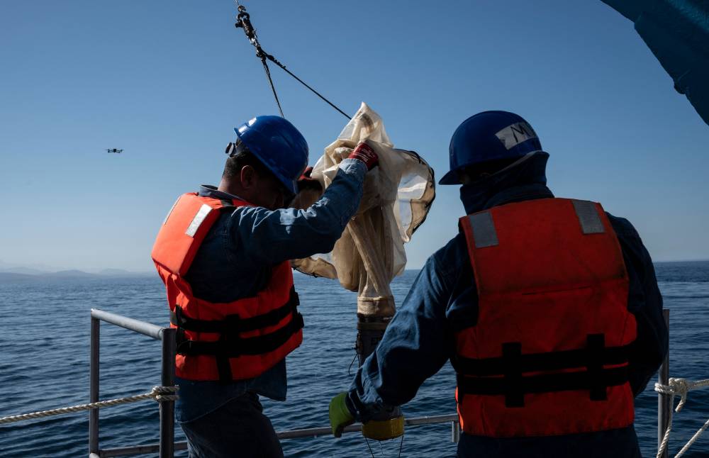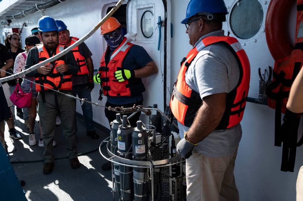 Members of a multidisciplinary team of researchers prepare to launch a probe to collect water samples at different depths from the Mexican Navy’s oceanographic research vessel ARM “Sayulita” in La Paz Bay, Baja California Sur state, Mexico, on August 31, 2024. According to a statement from the Mexican Navy, a multidisciplinary team of researchers and scientists aboard the Mexican Navy’s oceanographic research vessel ARM “Sayulita” have been working for the past two weeks on an investigation that aims, among other objectives, to study and protect the habitat of the loggerhead sea turtle (Caretta caretta). (Photo by Yuri CORTEZ / AFP).