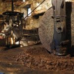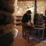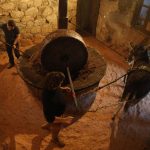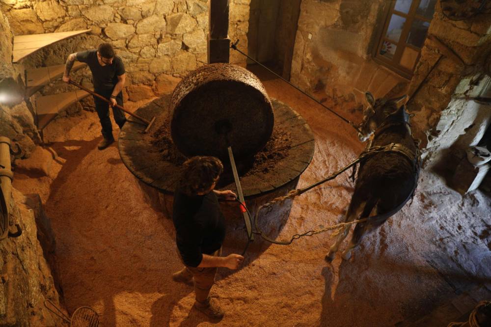 French olive oil producer Jean-Christophe Arrii (L) and his friend (R) crush olives with a millstone in his family property mill in Sainte-Lucie-de-Tallano, on the French Mediterranean island of Corsica, on November 24, 2023. Jean-Christophe Arrii is one of the last French olive oil producers to work in a traditional way with a millstone activated by a donkey inside a listed 300-year-old mill with olives harvested on centenary trees, only with nets and without any machine. (Photo by Pascal POCHARD-CASABIANCA / AFP)