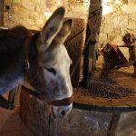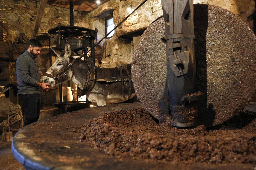 French olive oil producer Jean-Christophe Arrii feeds his donkey with dry bread after crushing olives with a millstone activated by the donkey in his family property mill to obtain olive oil in Sainte-Lucie-de-Tallano, on the French Mediterranean island of Corsica, on November 24, 2023. Jean-Christophe Arrii is one of the last French olive oil producers to work in a traditional way with a millstone activated by a donkey inside a listed 300-year-old mill with olives harvested on centenary trees, only with nets and without any machine. (Photo by Pascal POCHARD-CASABIANCA / AFP)