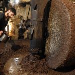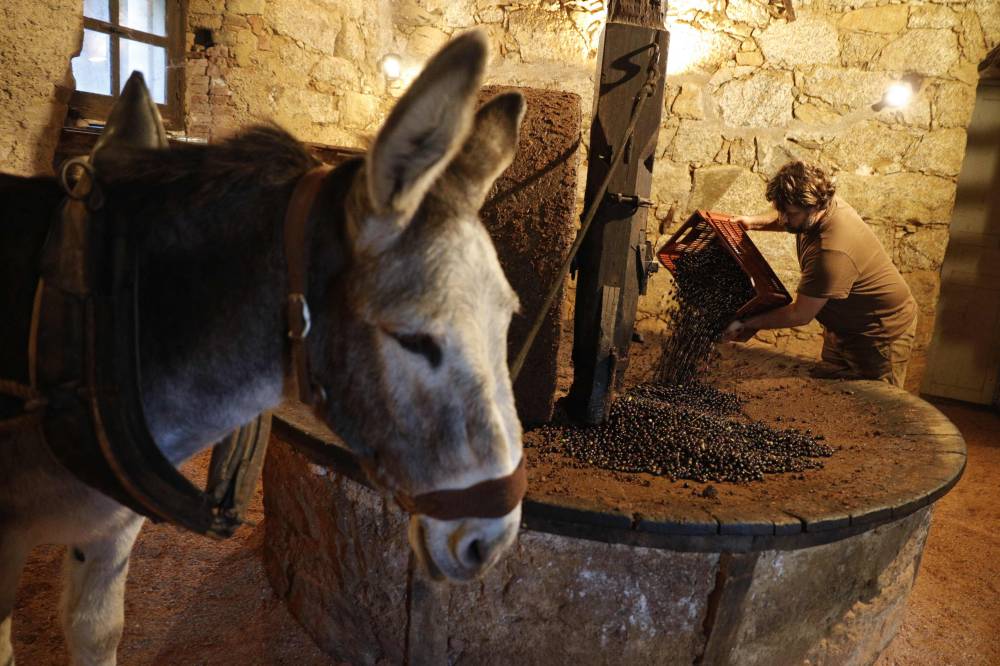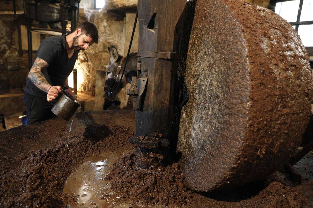 French olive oil producer Jean-Christophe Arrii adds some water as he crushes olives with a millstone in his family property mill in Sainte-Lucie-de-Tallano, on the French Mediterranean island of Corsica, on November 24, 2023. Jean-Christophe Arrii is one of the last French olive oil producers to work in a traditional way with a millstone activated by a donkey inside a listed 300-year-old mill with olives harvested on centenary trees, only with nets and without any machine. (Photo by Pascal POCHARD-CASABIANCA / AFP)