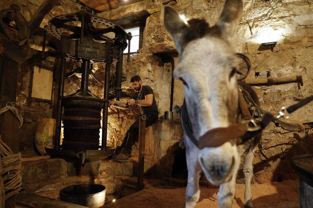French olive oil producer Jean Christophe Arrii uses a manual press from 1860 to obtain olive oil after crushing olives with a millstone activated by a donkey in his property mill in Sainte-Lucie-de-Tallano, on the French Mediterranean island of Corsica, on November 24, 2023. Jean-Christophe Arrii is one of the last French olive oil producers to work in a traditional way with a millstone activated by a donkey inside a classificated 300-year-old mill with olives harvested on centenary trees, only with nets and without any machine. (Photo by Pascal POCHARD-CASABIANCA / AFP)