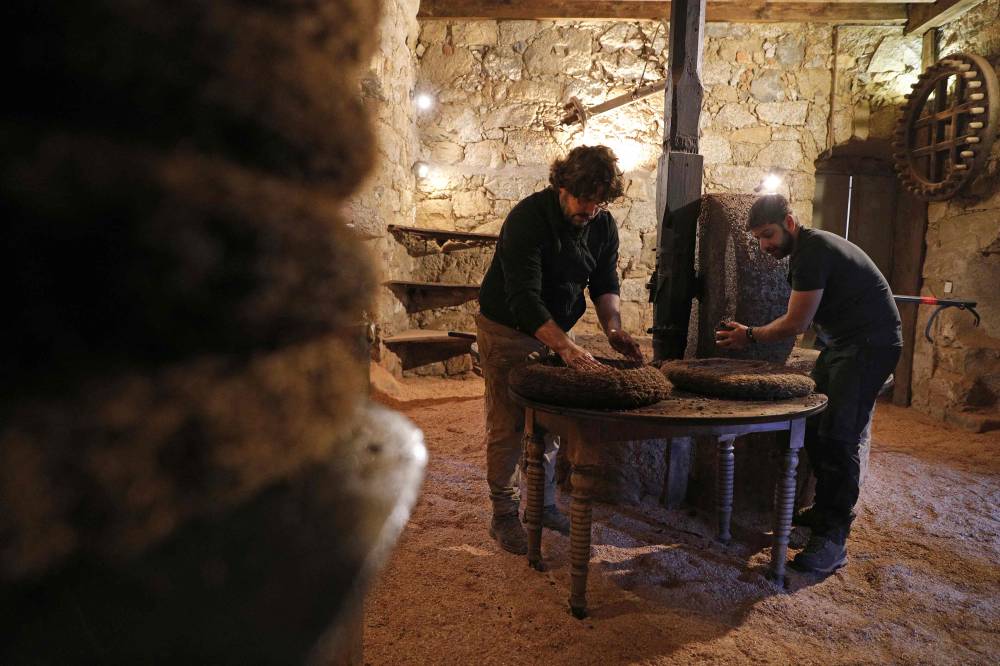 French olive oil producer Jean-Christophe Arrii (R) and his friend place olive paste inside cots, called “scourtins” (natural fiber-filters), before using a manual press from 1860 to obtain olive oil after crushing olives with a millstone activated by a donkey in the family property mill in Sainte-Lucie-de-Tallano, on the French Mediterranean island of Corsica, on November 24, 2023. Jean-Christophe Arrii is one of the last French olive oil producers to work in a traditional way with a millstone activated by a donkey inside a listed 300-year-old mill with olives harvested on centenary trees, only with nets and without any machine. (Photo by Pascal POCHARD-CASABIANCA / AFP)
