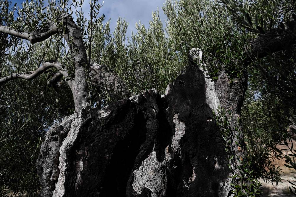 This photograph taken on November 14, 2023, shows an olive tree that has been struck by lighting, in a field near the city of Polygyros in the Halkidiki region. In mid-November, the temperature in the Halkidiki region of Polygyros, northern Greece was still over 15 degrees Celsius (59 degrees Fahrenheit). The warm weather has affected some six million trees in the region, according to producers and experts. (Photo by Sakis MITROLIDIS / AFP)