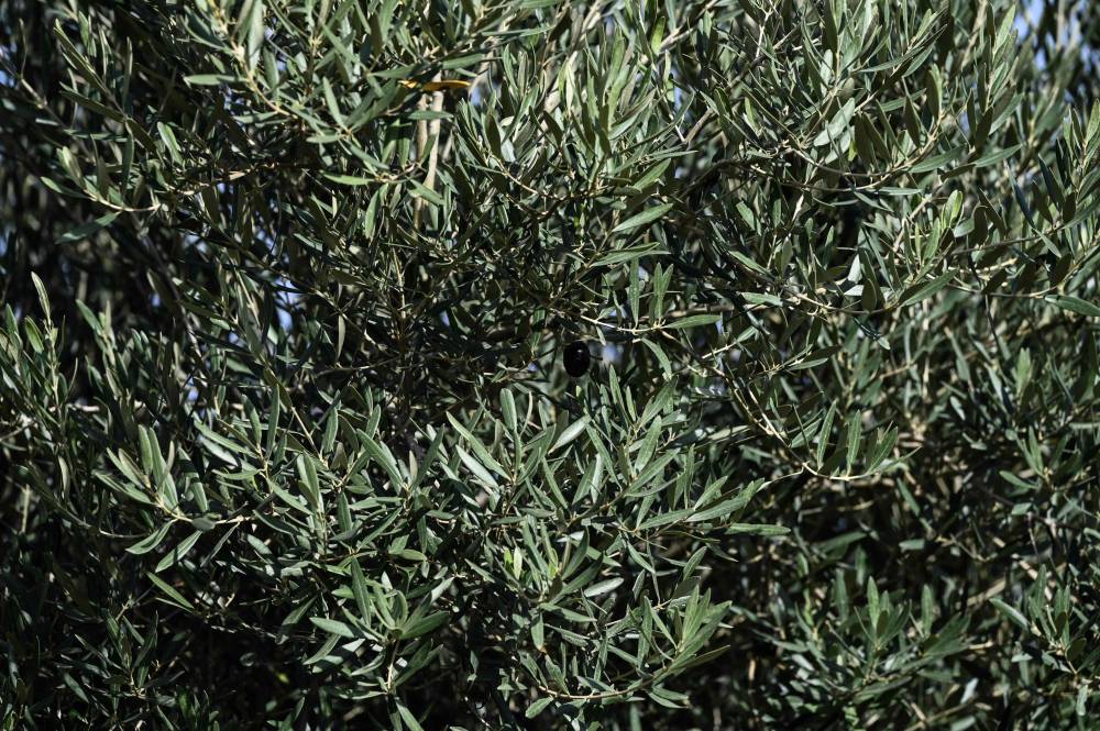 This photograph taken on November 14, 2023, shows an olive hanging on a tree in a field, near the city of Polygyros in the Halkidiki region. In mid-November, the temperature in the Halkidiki region of Polygyros, northern Greece was still over 15 degrees Celsius (59 degrees Fahrenheit). The warm weather has affected some six million trees in the region, according to producers and experts. (Photo by Sakis MITROLIDIS / AFP)