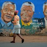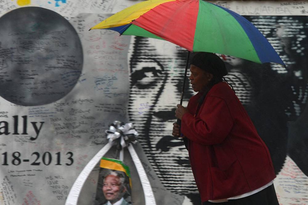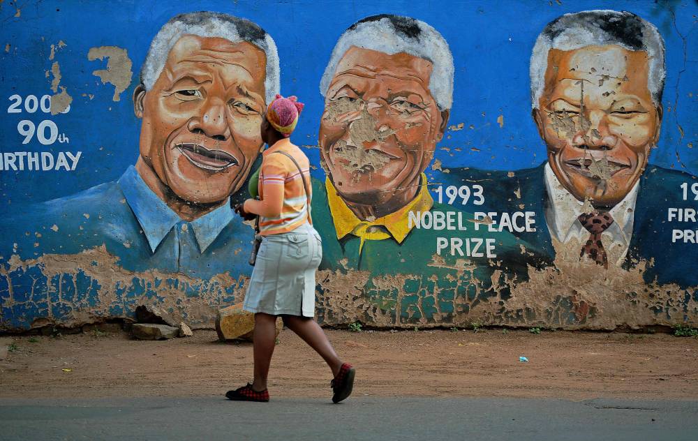 (FILES) A woman walks past a portrait of late South African President Nelson Mandela in Soweto on December 10, 2013. Anti-apartheid hero Nelson Mandela has been seen as a moral compass in his home South Africa, but ten years after his death his legacy is vigorously debated, with some questioning the quality of the country’s democracy. (Photo by Filippo MONTEFORTE / AFP)