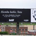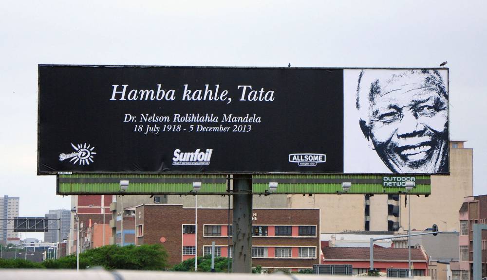 (FILES) A sign in Durban presents a message in Zulu reading “Farewell, Father”, in honor of late former South African President Nelson Mandela, on the day of Mandela’s burial in his hometown of Qunu, on December 15, 2013. Anti-apartheid hero Nelson Mandela has been seen as a moral compass in his home South Africa, but ten years after his death his legacy is vigorously debated, with some questioning the quality of the country’s democracy. (Photo by ANESH DEBIKY / AFP)