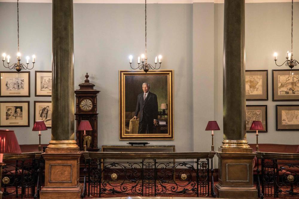 (FILES) A picture taken on December 6, 2018 shows an oil painting of former South African president and Anti Apartheid icon Nelson Mandela on the first floor of the Rand Club in Johannesburg. Anti-apartheid hero Nelson Mandela has been seen as a moral compass in his home South Africa, but ten years after his death his legacy is vigorously debated, with some questioning the quality of the country’s democracy. (Photo by MARCO LONGARI / AFP)