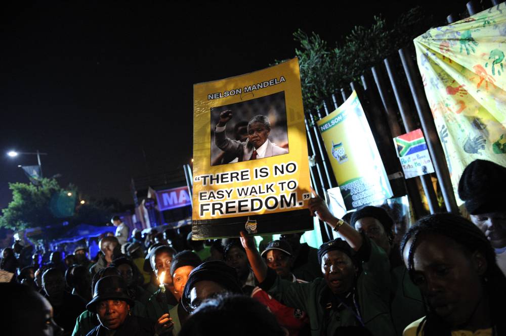 (FILES) People sing to pay a tribute to late former South African president Nelson Mandela outside his former house in Soweto on December 6, 2013. Anti-apartheid hero Nelson Mandela has been seen as a moral compass in his home South Africa, but ten years after his death his legacy is vigorously debated, with some questioning the quality of the country’s democracy. (Photo by STEPHANE DE SAKUTIN / AFP)