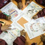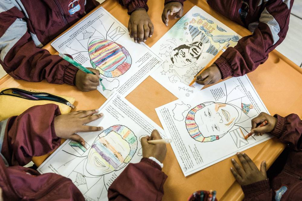 (FILES) Learners from Northlen Primary school colour drawings of former president Nelson Mandela as they mark his birthday in Durban on July 18, 2019. Anti-apartheid hero Nelson Mandela has been seen as a moral compass in his home South Africa, but ten years after his death his legacy is vigorously debated, with some questioning the quality of the country’s democracy. (Photo by RAJESH JANTILAL / AFP)