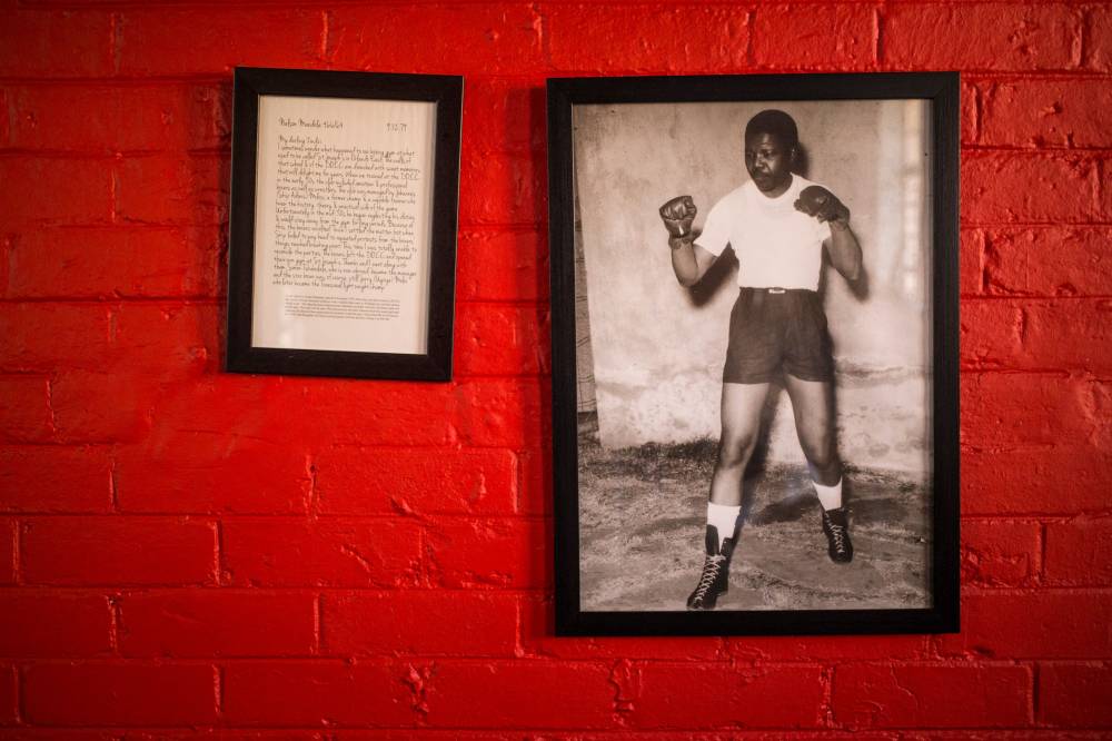 (FILES) A picture of anti-apartheid icon, Nelson Mandela, is displayed inside the gym at the Young Men Christian Association (YMCA) in Soweto on July 11, 2018 where Nelson Mandela used to train in the 1950’s. Anti-apartheid hero Nelson Mandela has been seen as a moral compass in his home South Africa, but ten years after his death his legacy is vigorously debated, with some questioning the quality of the country’s democracy. (Photo by Wikus DE WET / AFP)