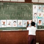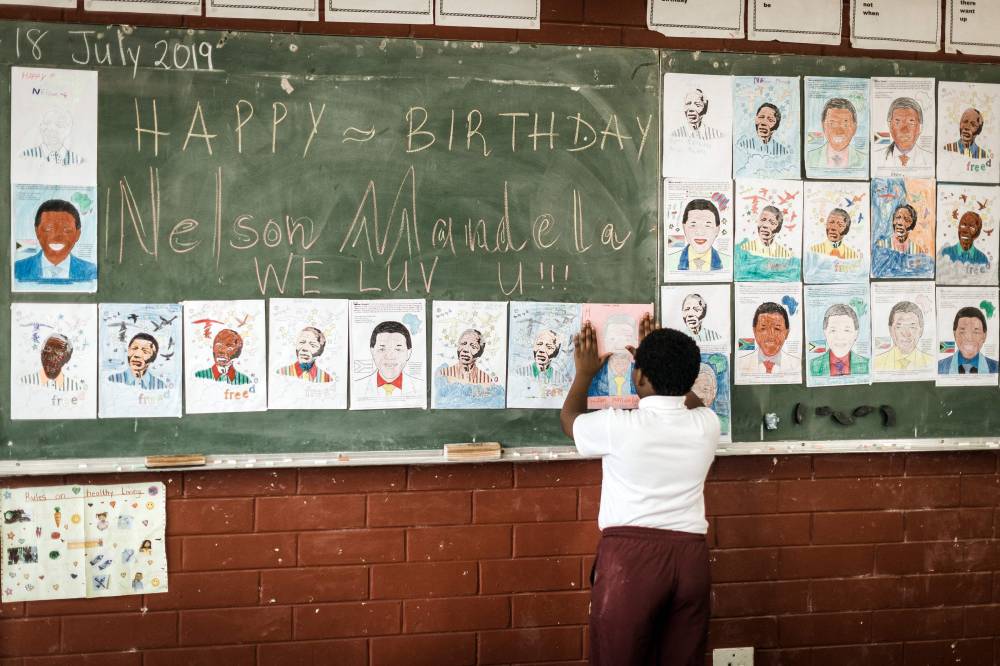 (FILES) A learner from Northlen Primary school places on the chalkboard posters of former president Nelson Mandela as they mark his birthday in Durban on July 18, 2019. Anti-apartheid hero Nelson Mandela has been seen as a moral compass in his home South Africa, but ten years after his death his legacy is vigorously debated, with some questioning the quality of the country’s democracy. (Photo by RAJESH JANTILAL / AFP)
