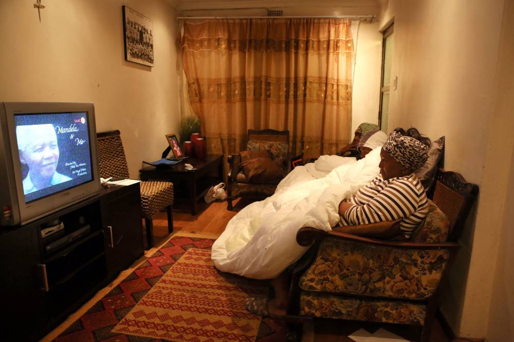 (FILES) Family members watch a tribute on TV in Cape Town following the announcement that former South African President Nelson Mandela had died on December 5, 2013. Anti-apartheid hero Nelson Mandela has been seen as a moral compass in his home South Africa, but ten years after his death his legacy is vigorously debated, with some questioning the quality of the country’s democracy. (Photo by Jennifer BRUCE / AFP).