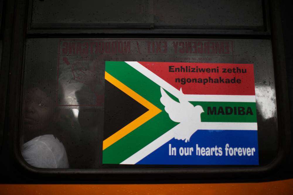 (FILES) A woman sits inside a bus that will take her home after she attended the memorial service for late South African President Nelson Mandela at Soccer City Stadium in Johannesburg on December 10, 2013. Anti-apartheid hero Nelson Mandela has been seen as a moral compass in his home South Africa, but ten years after his death his legacy is vigorously debated, with some questioning the quality of the country’s democracy. (Photo by Marco LONGARI / AFP).