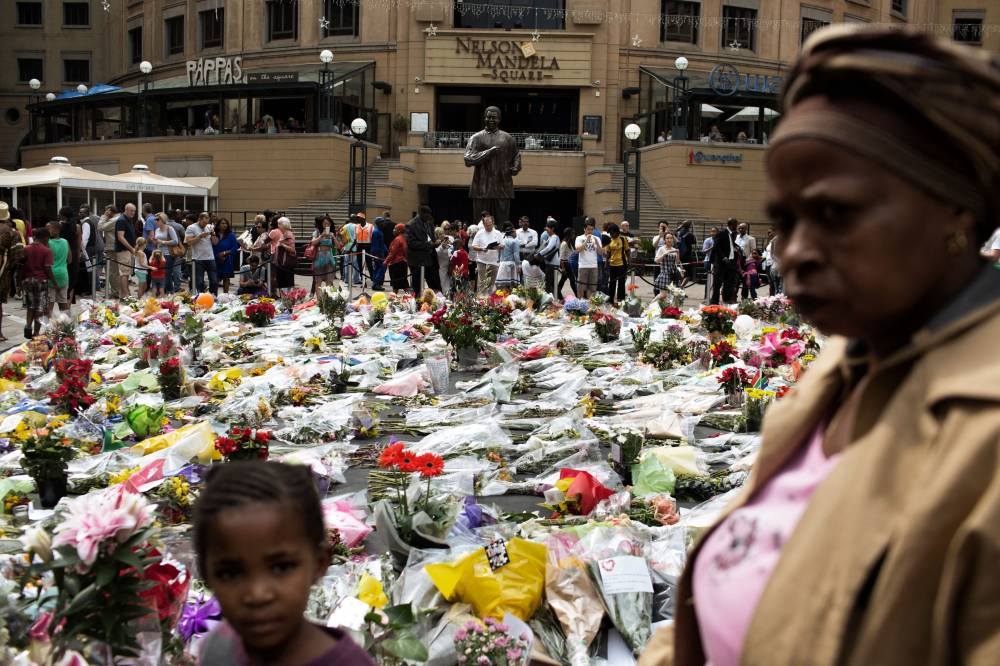 (FILES) South Africans queue to pay respect to former South African President Nelson Mandela on Mandela Square in Sandton City in Johannesburg on December 8, 2013. Anti-apartheid hero Nelson Mandela has been seen as a moral compass in his home South Africa, but ten years after his death his legacy is vigorously debated, with some questioning the quality of the country’s democracy. (Photo by Marco LONGARI / AFP).