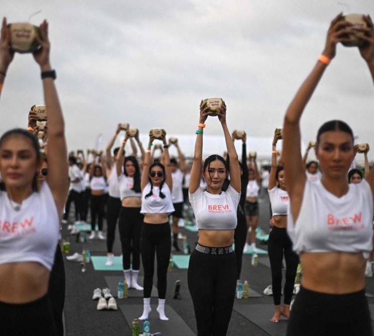 Yoga enthusiasts hold coconuts while performing yoga during a sunrise "Brew Yoga" event on a runway at Suvarnabhumi Airport in Bangkok on April 27, 2024. Stretching their fingertips to the reddening sky, hundreds of yoga devotees rolled out their mats on the runway of Bangkok's main airport, practising their downward dog as early morning flights rumbled overhead. (Photo by MANAN VATSYAYANA / AFP)