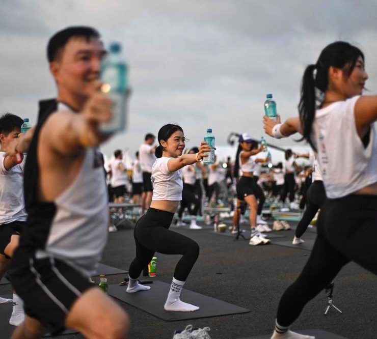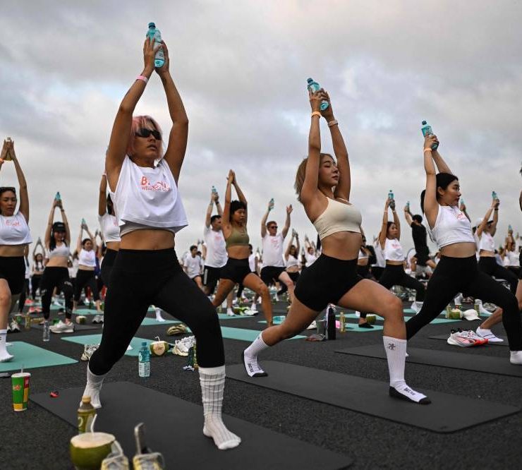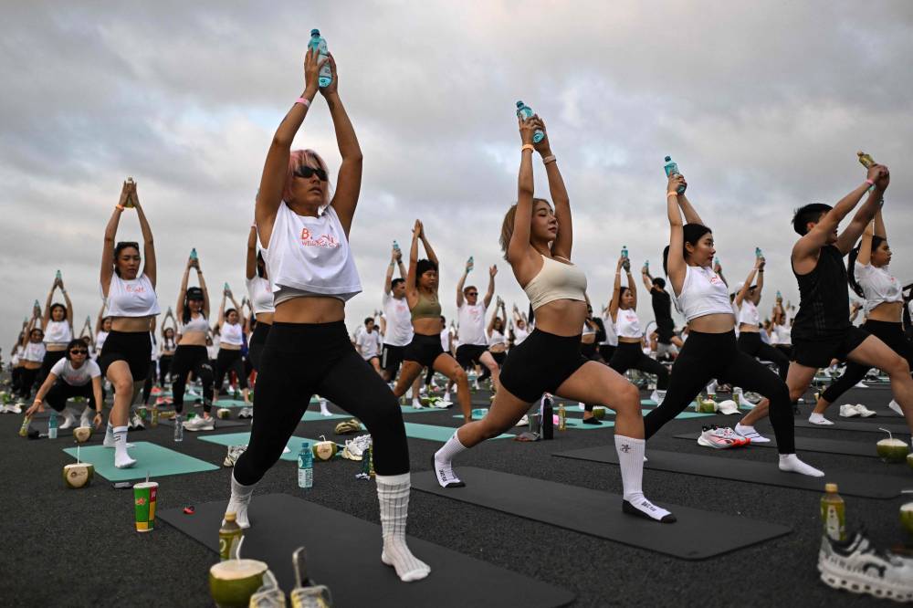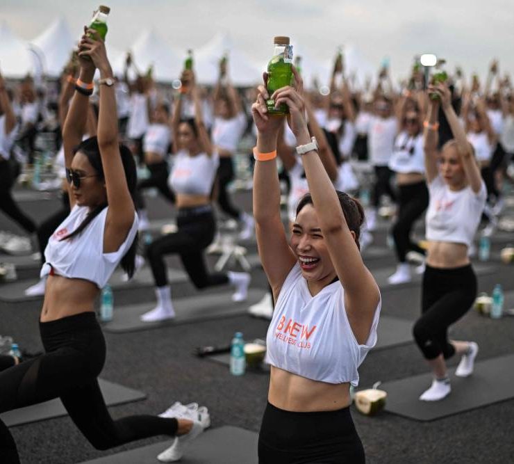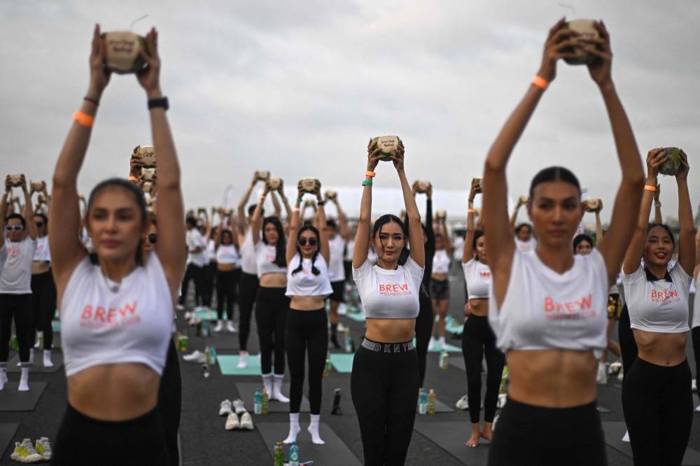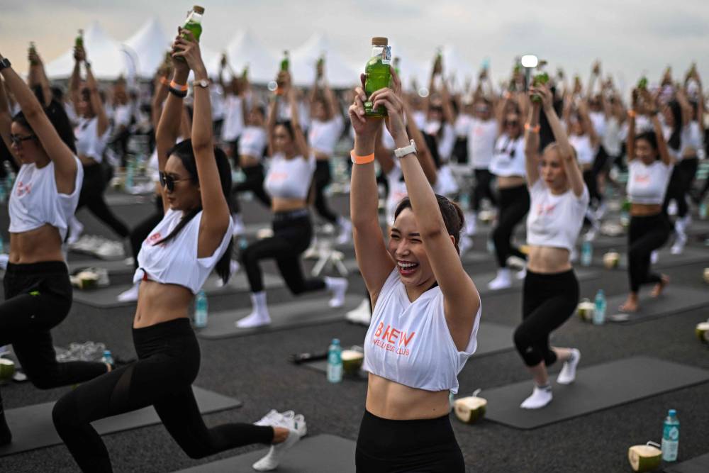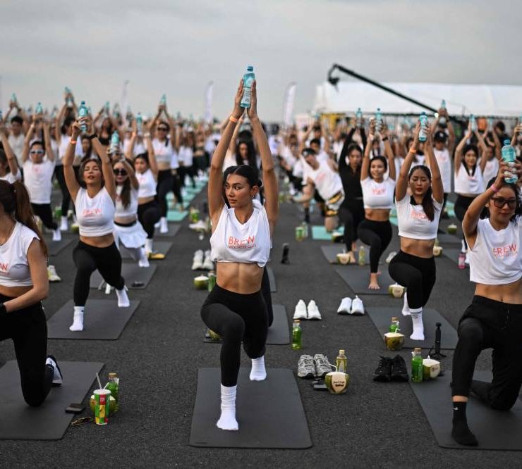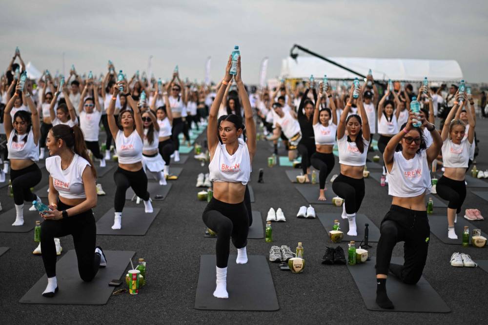 Yoga enthusiasts hold bottles of ice tea while performing yoga during a sunrise "Brew Yoga" event on a runway at Suvarnabhumi Airport in Bangkok on April 27, 2024. Stretching their fingertips to the reddening sky, hundreds of yoga devotees rolled out their mats on the runway of Bangkok's main airport, practising their downward dog as early morning flights rumbled overhead. (Photo by MANAN VATSYAYANA / AFP)