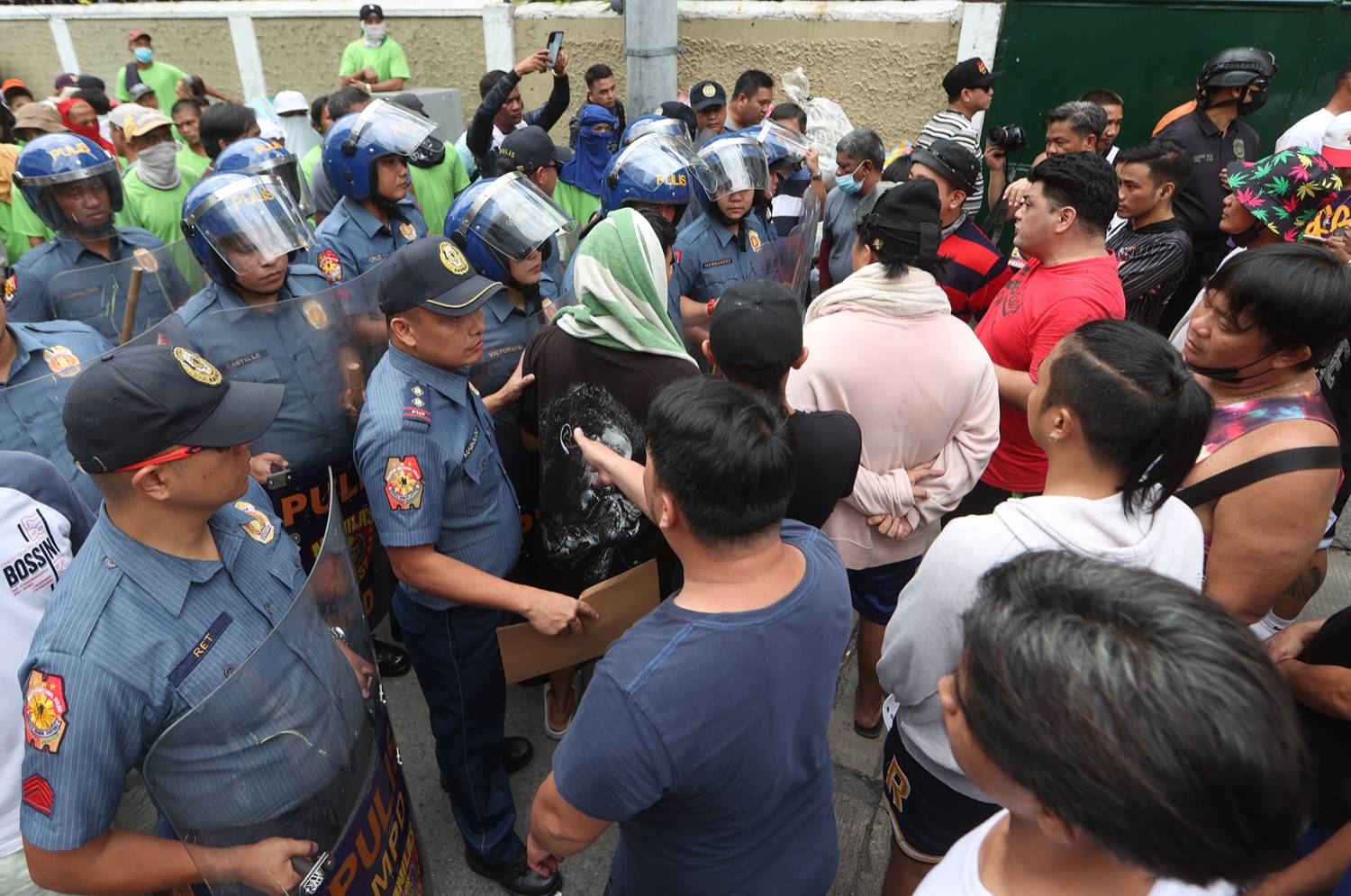 DEMOLITION OPERATION / JANUARY 11, 2024 Tension arises as members of the Manila Police District and demolition team advance their position during a demolition operation at the corner of Paco Roman street corner Syquia street in Sta Ana Manila, on 11 January 2024. INQUIRER PHOTO / NIÑO JESUS ORBETA.