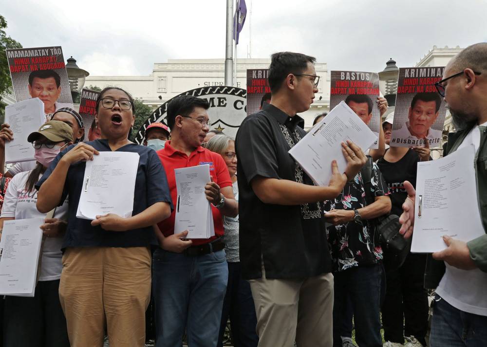 Members of human rights group Karapatan, together with relatives of victims of extrajudicial killings and their lawyers, appear at the Supreme Court on Friday to file a disbarment complaint against Rodrigo Duterte. They argued that the former president’s drug war violated the high court’s Code of Professional Responsibility and Accountability, and also constituted the offense of conduct unbecoming of a lawyer. “It is time for us to appeal to the Supreme Court to reinforce how the law should … [protect] victims of human rights violations as they seek justice and ensure dignified and proper conduct in the practice of law,” said lawyer Vicente Jaime Topacio, one of the petitioners. —RICHARD A. REYES