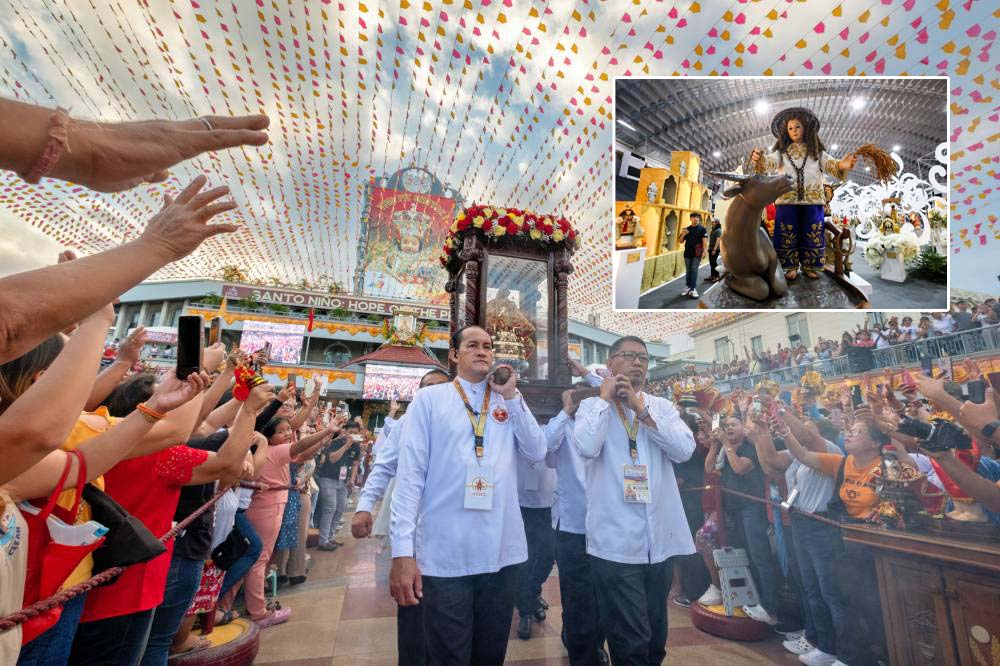 Pastoral ministers on Friday carry the glass case containing the Sto. Niño de Cebu as they kick off the annual “traslacion,” or procession of the image to the National Shrine of St. Joseph in Mandaue City. In Malolos, Bulacan (inset), visitors at Capitol Gymnasium on Saturday view an exhibit featuring a variety of Sto. Niño images, including the Sto. Niño El Labrador de Paombong holding rice stalks before a kneeling carabao. The Eternal Child Jesus, ever youthful yet the oldest Catholic icon in the Philippines, was first introduced by Spanish missionaries accompanying Ferdinand Magellan upon his arrival in the archipelago in March 1521. The feast of the Sto. Niño was eventually moved to the third week of January to give way to the Lenten period and continues to be celebrated in various parts of the country. —PHOTOS BY EMMANUELLE SAWIT AND LYN RILLON
